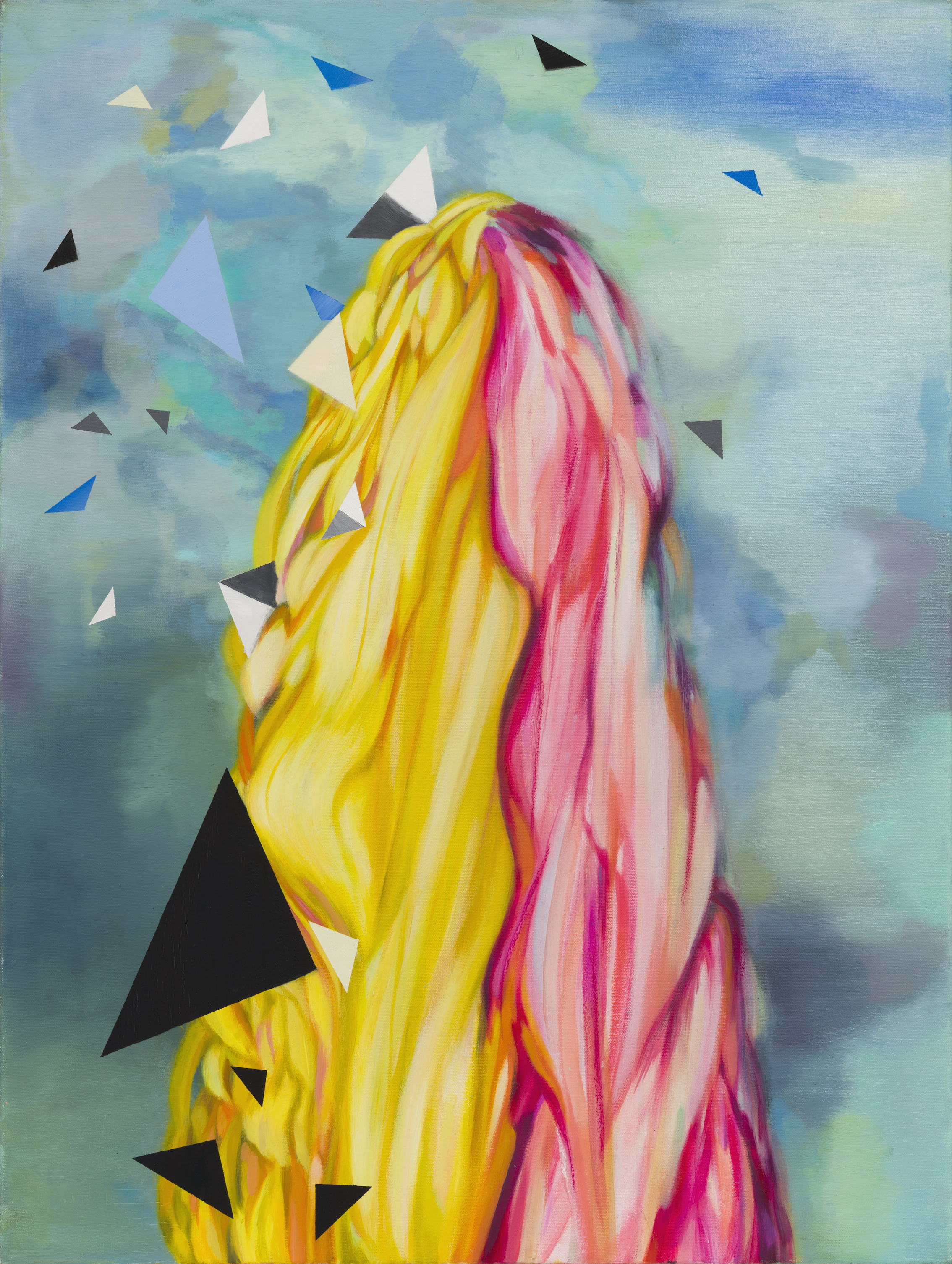 A mixture of flat triangular forms, mostly airborne, and flat on the picture plane slightly undermines a traditional perspectival reading. Predominantly there is a shallow or tightly enclosed space created from the spatial arrangement of the entangled forms in the foreground. A snaking red, blue, yellow and white candy stick at the apex of the arrangement meanders down to, or up from, the base. It is also partly submerged. Likewise, the tricolour ribbon also winds its way from the bottom of the composition to the apex. An echo or reflexion of the red, white and blue form is placed behind this mysterious configuration to suggest some depth and a flattening simultaneously. Solidly rendered, yet flat triangles (X7 white, X5 red, X2 blue and X1 black – for it seems pertinent to count them) float around or penetrate the central mass/form. Unexpectedly, centre-left, a curvaceous form that might be fish or snake skin, or possibly a hand-dyed scarf on a slender shoulder, links top to bottom or head to torso.