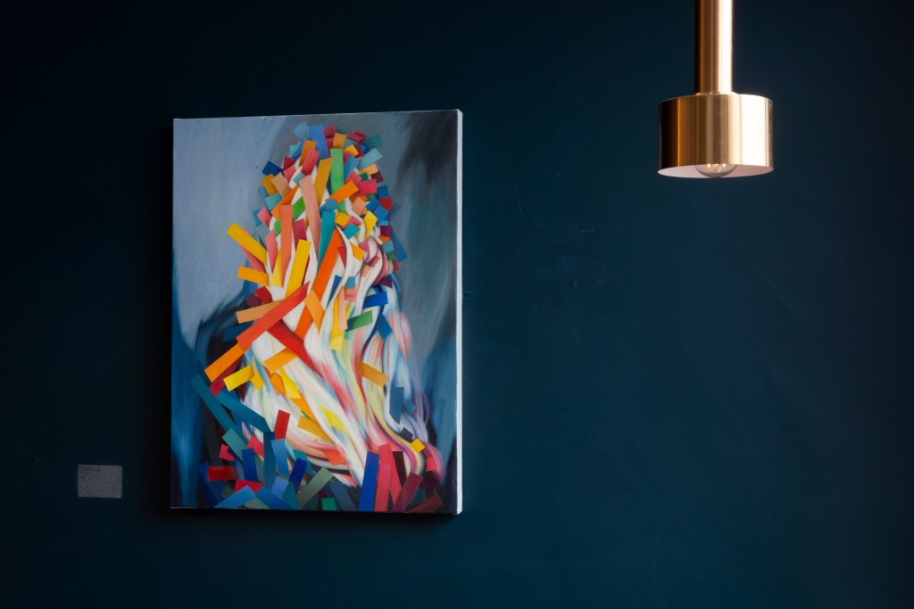 Thereafter the viewer is surely connected with each work beyond the immediate visual impact of the intriguingly titled pictures. As much as we might long for the day that we can forget about the ongoing pandemic that has restricted us physically and geographically, an unexpected benefit might be that we start to appreciate and more fully understand our truly global ecosystem that relies on cooperation rather than unabated competition and nationalistic introspection. Or at the very least, we might take what is near as a fascinating take off point for the imagination. For Sinclair it might be the trivial bits and pieces that one’s children might play with vis-à-vis the bigger issues that concern us.. This is an interpretation of superposition (another of her series of paintings) in which something (or a system) can be in multiple states at the same time until it is measured. It’s certainly the case that if we take the suggestion of the portrait from these paintings we must ultimately place the notion of self or identity within an environment, which can be either physical or metaphysical… but perhaps this is a step too far.