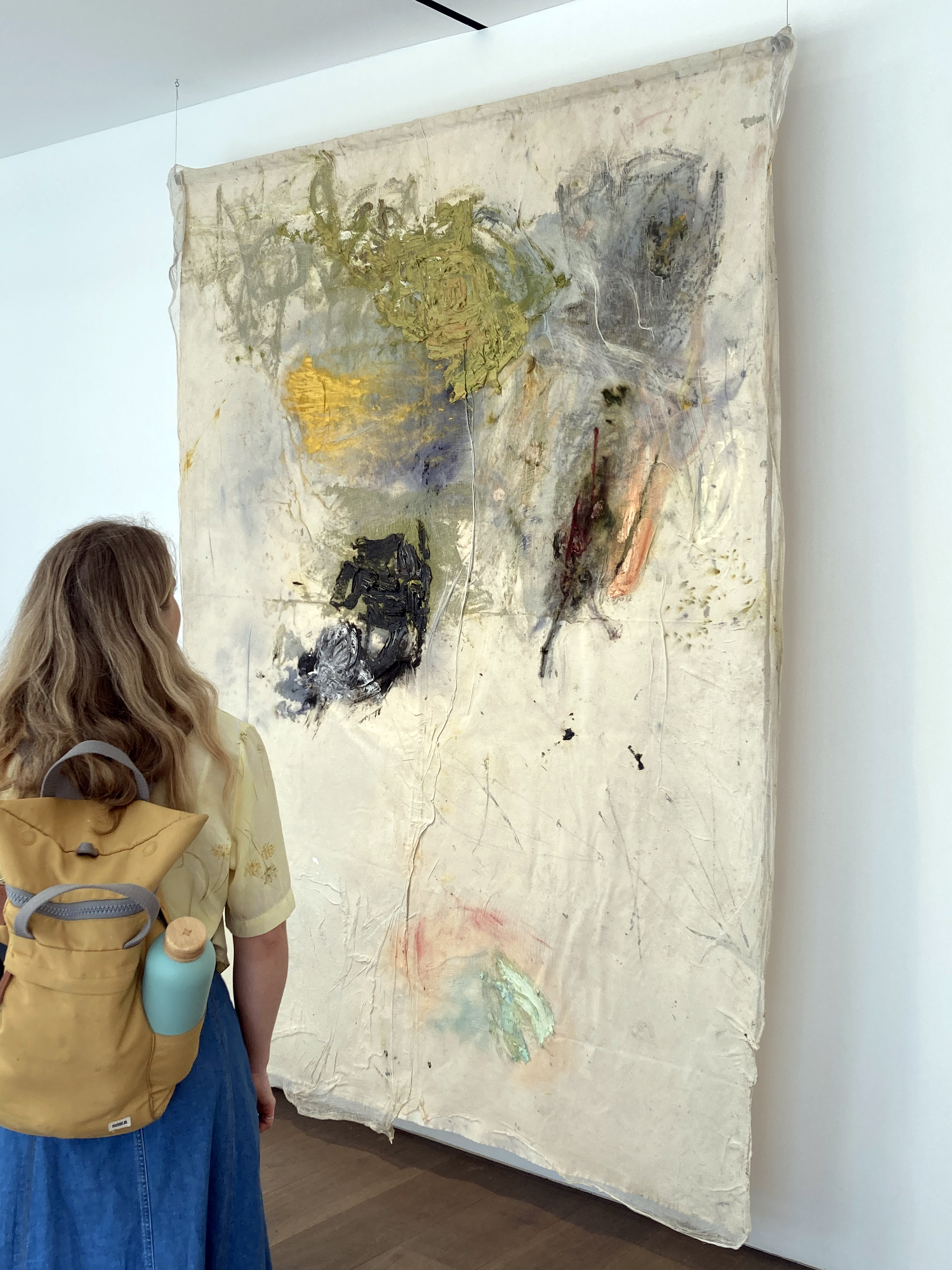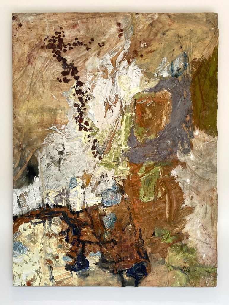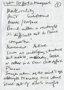 It was the final day of the exhibition at Alma Pearl and I had booked a place for Lydia Gifford’s interview with art critic, Tom Morton. My daughter’s here too. Before the discussion we had ample time to look at the work displayed on the walls. There were written notes to be made too as, inevitably, personal thoughts emerged from the looking. As viewers this is one way of participating. It’s not everyone’s practice but one legitimately connects to the visual and physical by recording reactions in this way. Others will talk excitedly with a fellow viewer (not my style) or will keep their thoughts to themselves. But there is undoubtedly a dialogue of some kind going on, which may well echo back to what transpired for the artist in her studio, out of doors in the countryside or in the urban environment. Either way, the experiences of the artworks are a form of an earthbound, quotidian transcendence for artist and viewer alike. The viewer must be as open minded as the artist and to make the experience of looking at artworks as active as possible.