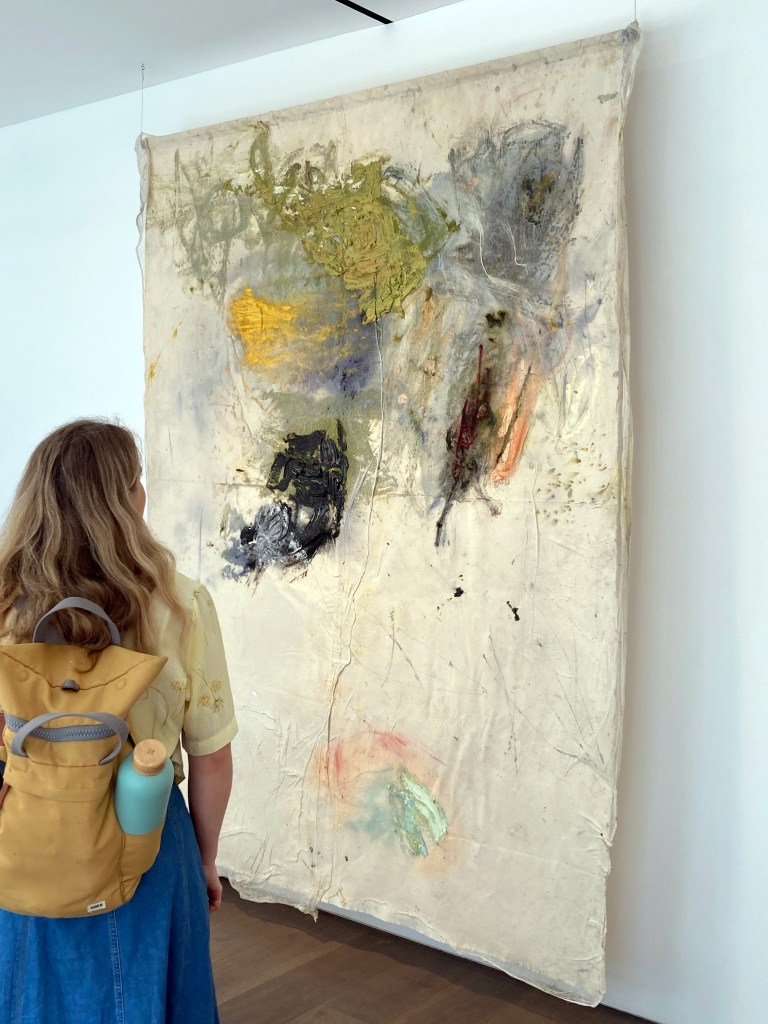 Alma Pearl is a relatively new space, barely a year old. This was my first visit and I was enraptured by this display. There were just eight paintings plus half a dozen fabric/collage pieces (subtitled – sensitive fibres) that made for an exhibition within an exhibition. Despite generous expanses of white space between the paintings the walls felt full due to the visual impact of the works of various sizes. The curation, therefore, was just right.
